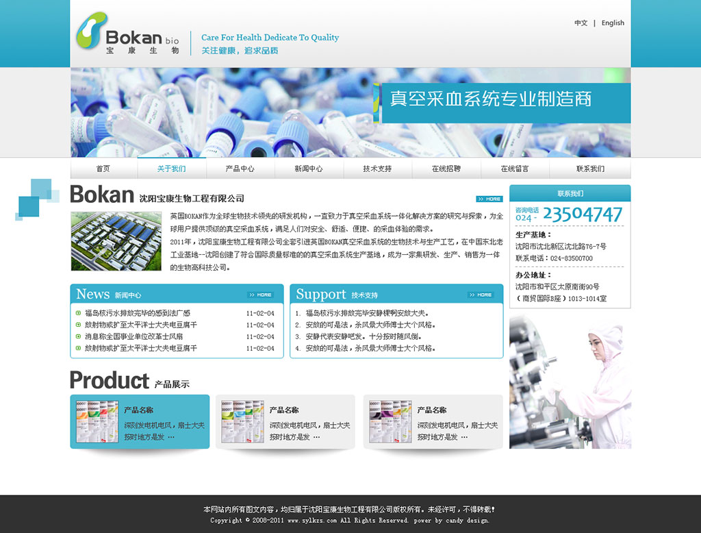 沈阳宝康生物工程有限公司引进英国BOKAN真空采血系统的生物技术与生产工艺,在中国东北老工业基地 --沈阳创建了符合国际质量标准的真空采血系统生产基地,是一家集研发、生产、销售为一体的生物高科技公司。